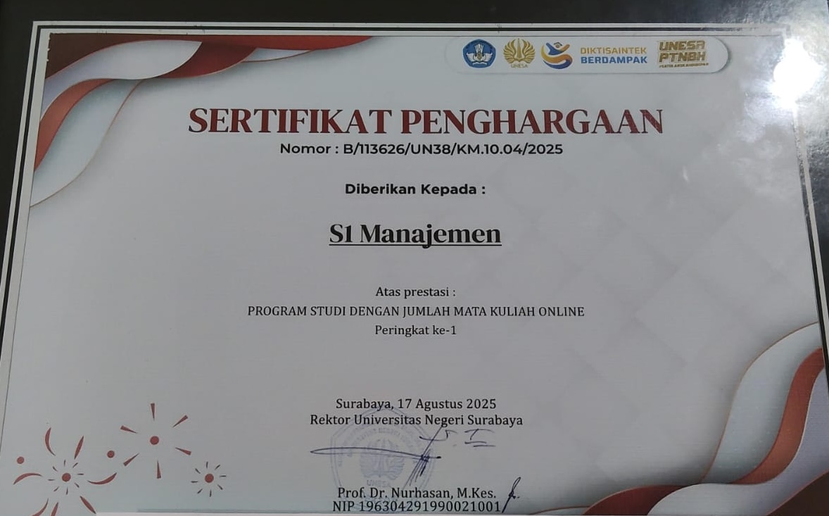 Selamat dan sukses untuk Program Studi S1 Manajemen Fakultas Ekonomika dan Bisnis Universitas Negeri Surabaya (Unesa) atas diraihnya Silver Medal pada